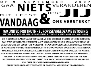 Diverse organisaties uit de vredesbeweging, de mensenrechtenbeweging en de 9/11-truthbeweging vinden elkaar in gezamenlijke eisen, alsmede in solidariteit met het Amerikaanse volk onder Bush. Op 11 september is er in de VS bovendien een algemene staking afgekondigd. In Brussel gaat het onder meer over de mogelijke voorkennis over 9/11, over privacy-wetgeving en over armoede en alternatieven voor het huidige monetaire systeem. In de VS zijn daarnaast Guantanamo, Irak, verkiezingsfraude, martelschandalen, inperking van vrijheden en burgerrechten, oorlogswinsten en uiteraard het 9/11-bedrog onderwerp van de aangekondigde staking.